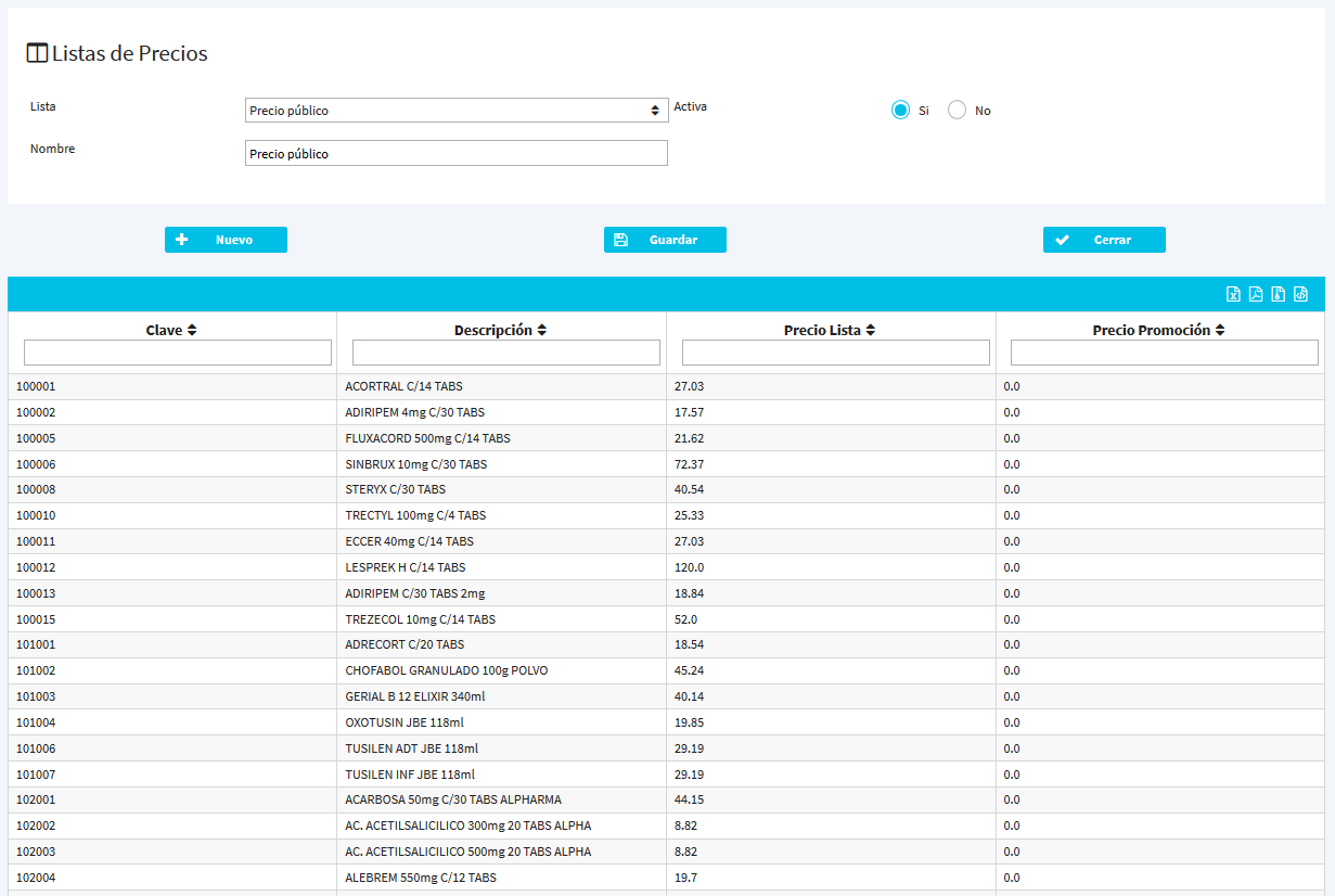 En el módulo podemos dar de alta diferentes tipos de listas de precio y estas pueden ser asignadas a los productos o a los clientes. Un producto puede tener diferentes tipos de listas y estas pueden seleccionar al momento de generar un tipo de documento de ingresos.
